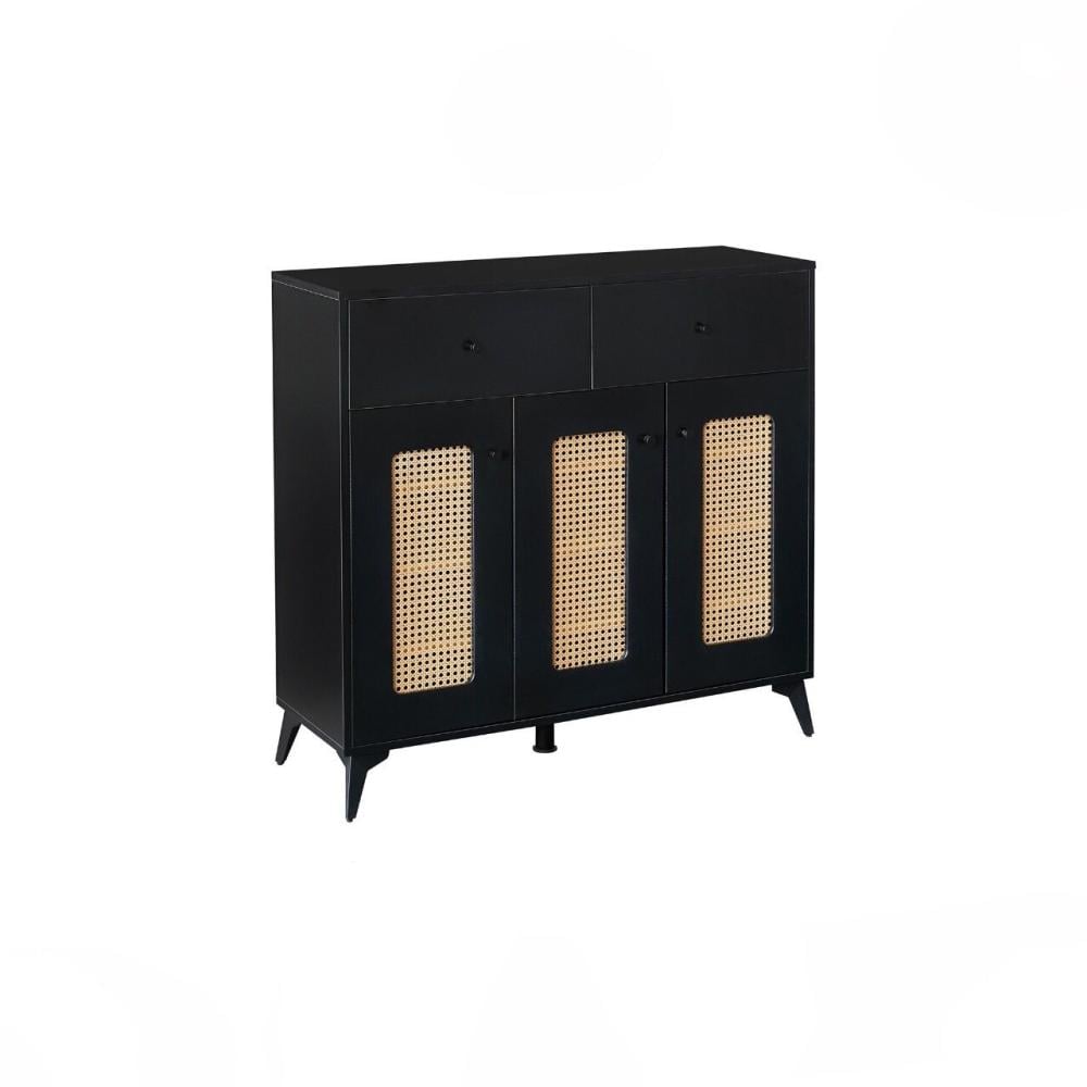 خزانة أحذية أنيقة تجمع بين العملية والجمال، مصنوعة من الخشب المطلي مع أبواب من الخوص الطبيعي لإضفاء لمسة دافئة وطبيعية على المكان. تحتوي على درجين علويين لتخزين الإكسسوارات الصغيرة، وأبواب سفلية تخفي 4 رفوف متعددة لترتيب الأحذية بشكل منظم وأنيق.
