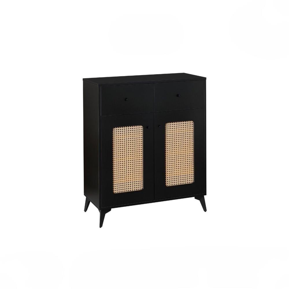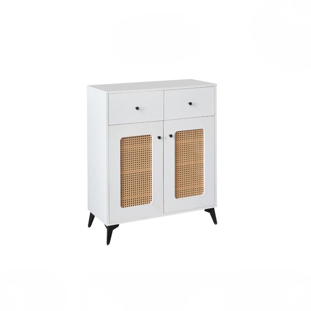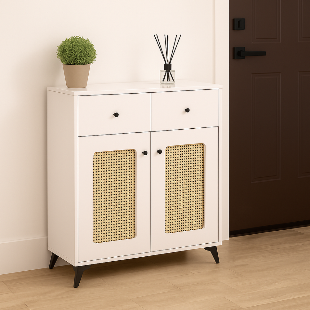خزانة أحذية أنيقة تجمع بين العملية والجمال، مصنوعة من الخشب المطلي مع أبواب من الخوص الطبيعي لإضفاء لمسة دافئة وطبيعية على المكان. تحتوي على درجين علويين لتخزين الإكسسوارات الصغيرة، وأبواب سفلية تخفي 4 رفوف متعددة لترتيب الأحذية بشكل منظم وأنيق.