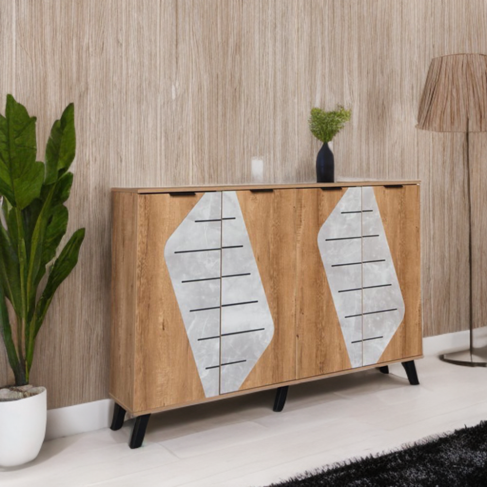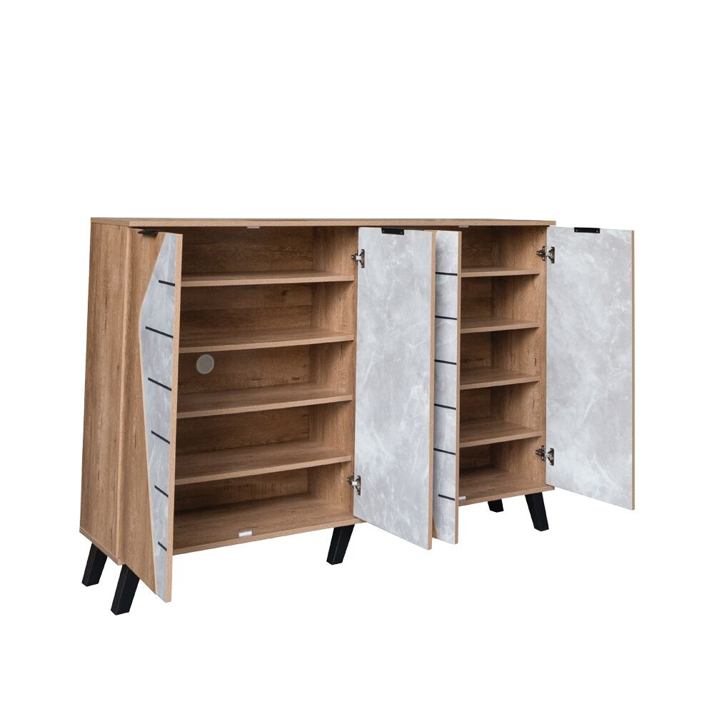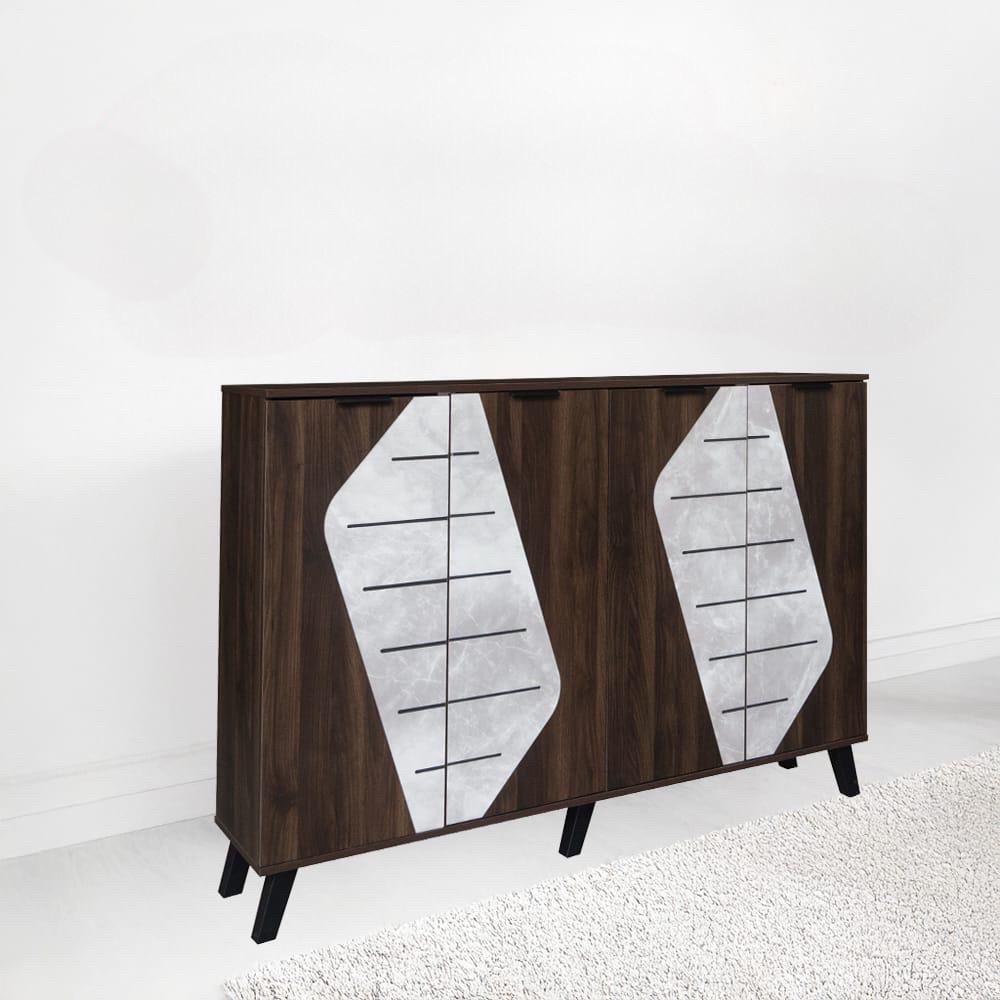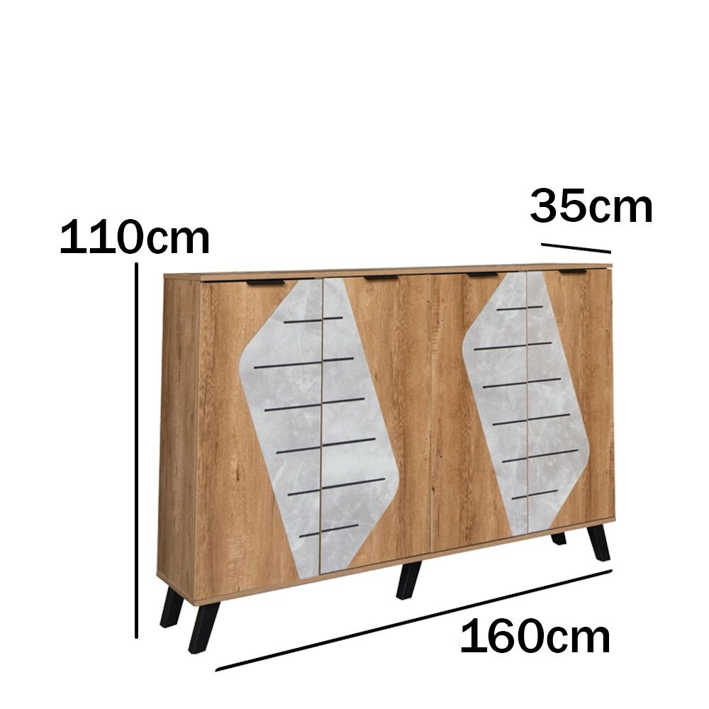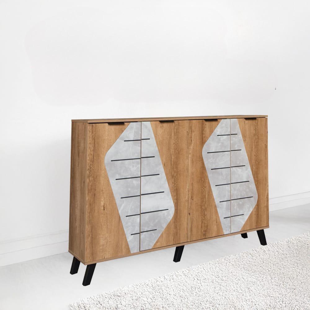 استمتعي بتخزين الأحذية بكل أناقة مع الخزانة العصرية ذات المساحة الواسعة , هذه الخزانة مصممة من خشب ماليزي عالي الجودة لتوفير 2 أقسام كبيرة و 5 أرفف مقسمة مما يجعلها الخيار المثالي لتنظيم وتخزين جميع أنواع الأحذية بأناقة. 4 أبواب تحمي الأحذية من الغبار وتضيف لمسة فاخرة. يتميز تصميمها العصري باللونين الرصاصي والخشبي، مما يجعلها مثالية للمداخل، غرف النوم، أو غرفة المعيشة.