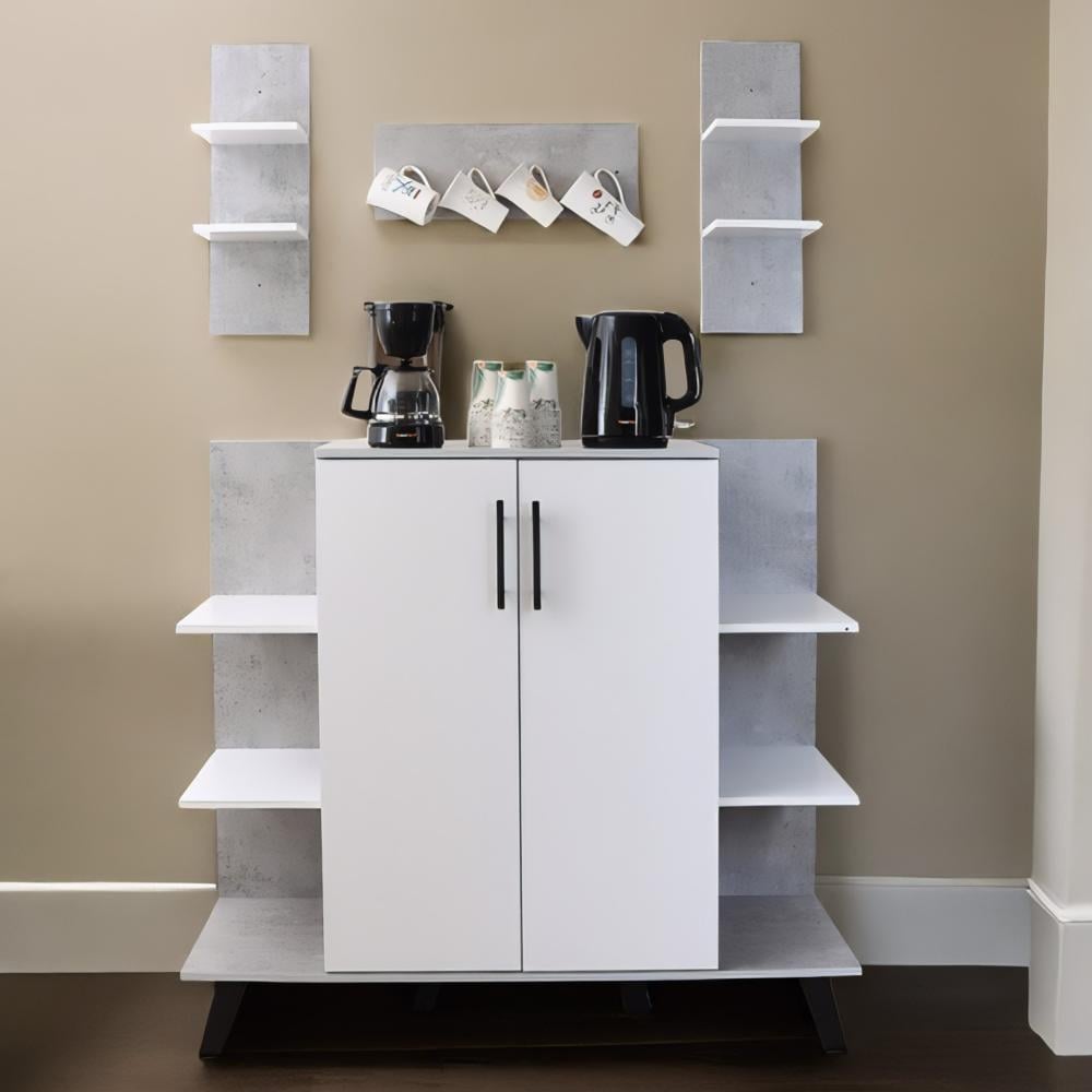 - يتميز ركن القهوة بتصميم عصري يجمع بين اللونين الرمادي والأبيض، وبالتالي يضيف لمسة جمالية راقية تناسب مختلف أنماط الديكور المنزلي.