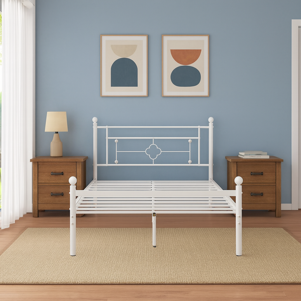 سرير معدني أنيق وعصري مصنوع من هيكل فولاذي متين، يتميز بتصميم بسيط مزود بزخرفة هندسية على اللوح الخلفي. يوفر دعماً ممتازاً للمرتبة بفضل القضبان المتوازية، مما يجعله خياراً عملياً لغرف النوم، الاستراحات، أو غرف الضيوف.