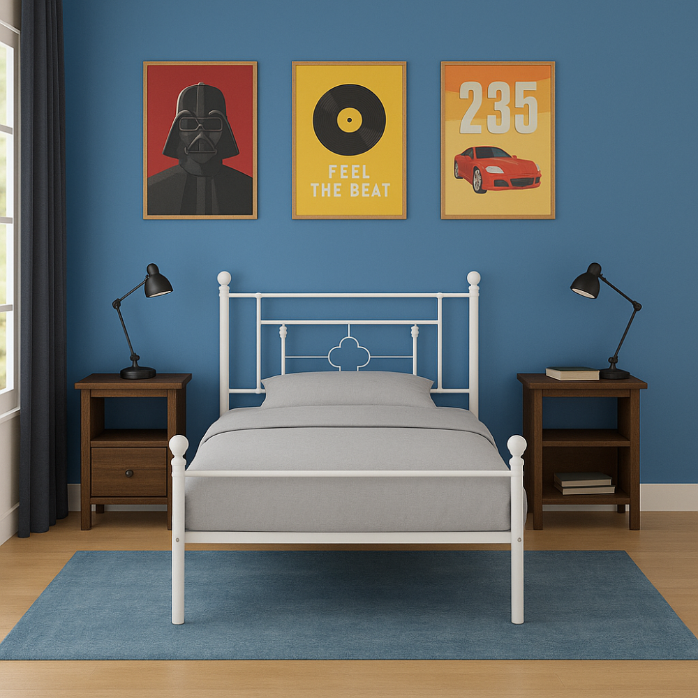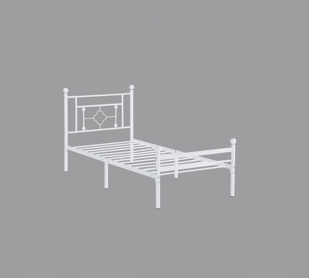 سرير معدني أنيق وعصري مصنوع من هيكل فولاذي متين، يتميز بتصميم بسيط مزود بزخرفة هندسية على اللوح الخلفي. يوفر دعماً ممتازاً للمرتبة بفضل القضبان المتوازية، مما يجعله خياراً عملياً لغرف النوم، الاستراحات، أو غرف الضيوف.