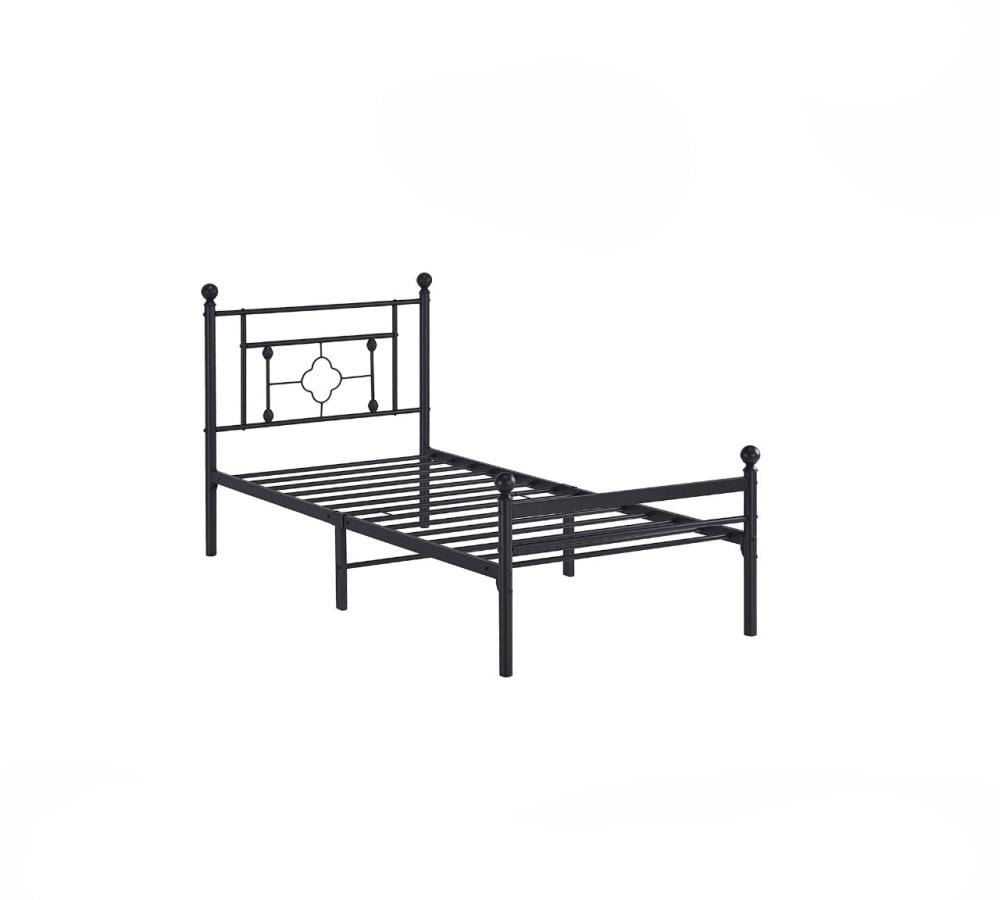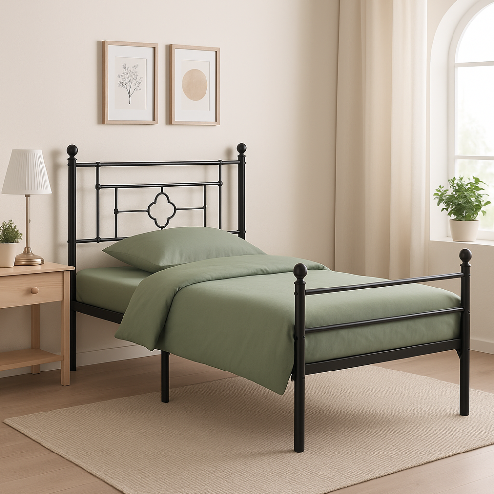 سرير معدني أنيق وعصري مصنوع من هيكل فولاذي متين، يتميز بتصميم بسيط مزود بزخرفة هندسية على اللوح الخلفي. يوفر دعماً ممتازاً للمرتبة بفضل القضبان المتوازية، مما يجعله خياراً عملياً لغرف النوم، الاستراحات، أو غرف الضيوف.