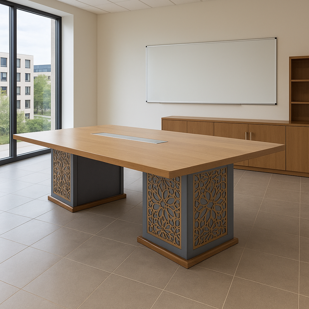 طاولة اجتماعات فاخرة تجمع بين الأناقة والفخامة والعملية. تأتي بتصميم مستطيل مع قاعدة مزخرفة بنقوش هندسية مستوحاة من الطراز العربي الحديث، مما يضفي لمسة فنية راقية على بيئة العمل أو غرفة الاجتماعات. سطح الطاولة العريض والمسطح يوفر مساحة كافية للاجتماعات الجماعية أو جلسات العمل الرسمية.