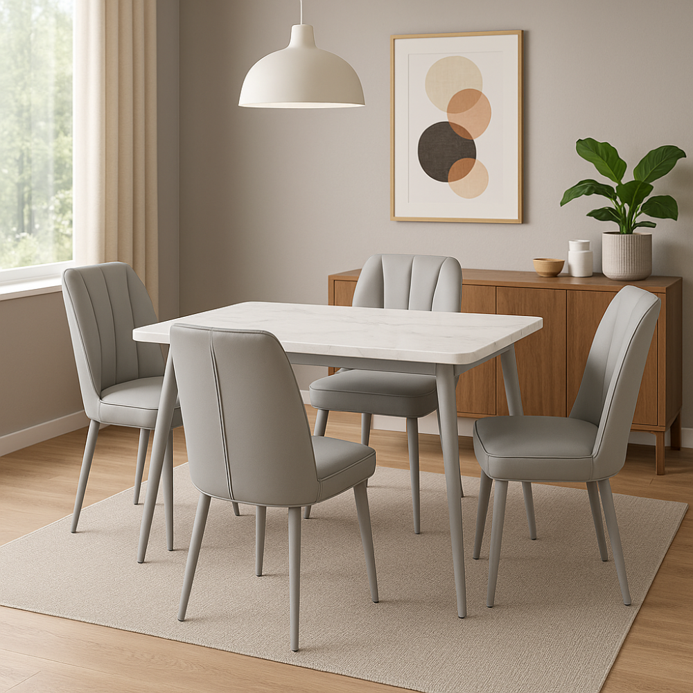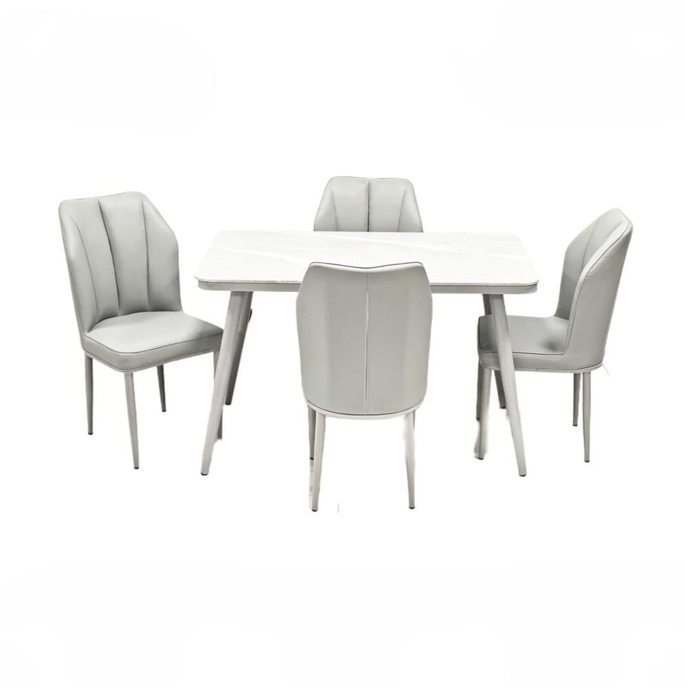 طقم طاولة سفرة أنيق وعصري مكوّن من طاولة مستطيلة الشكل بأرجل قوية معدنية سطح رخام لون رمادي فاتح ، يرافقها 4 كراسي جلد مبطنة ومريحة باللون الرمادي الفاتح لإضفاء لمسة راقية على غرفة الطعام.