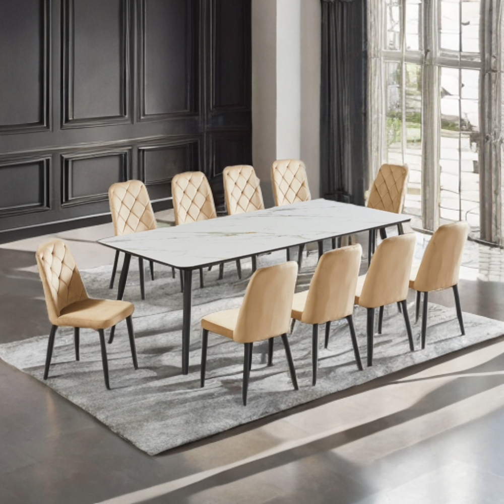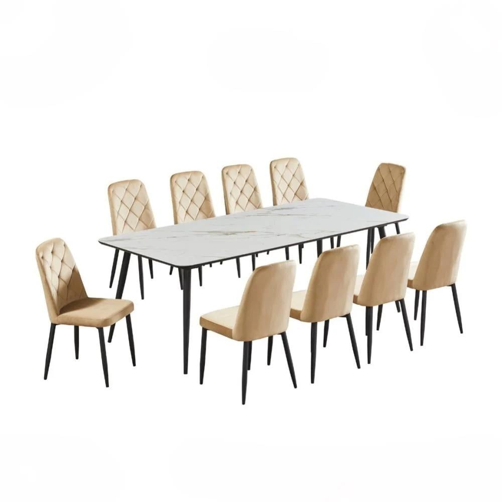 - عندما يلتقي التصميم المميز بالجودة الفائقة! استمتع بطقم طاولة سفرة 10 كراسي بسطح سيراميك أنيق، خيار مثالي لجلسات الطعام العائلية المميزة.