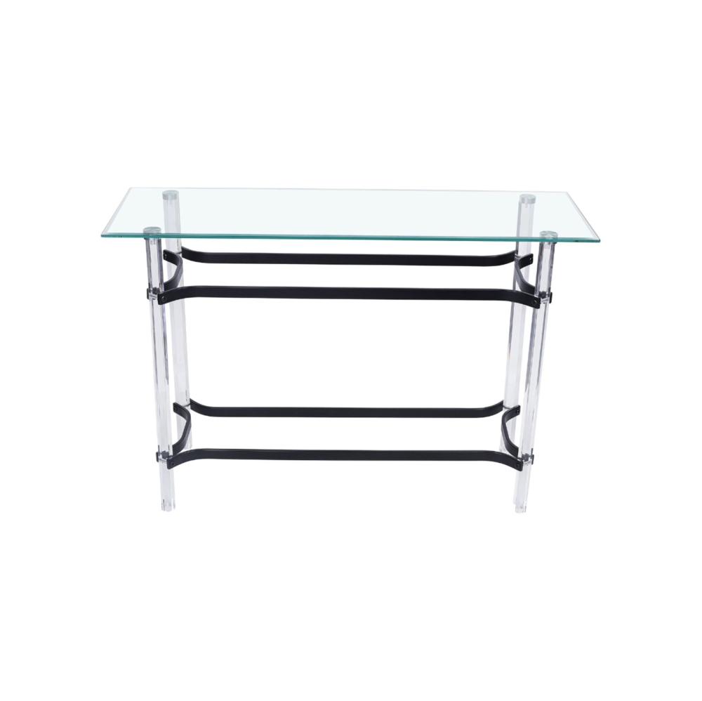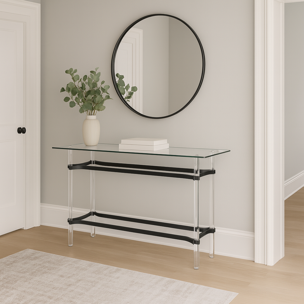 طاولة كونسول أنيقة بتصميم عصري يجمع بين الزجاج الشفاف واللمسات المعدنية الأسود الفخمة . مثالية لوضعها في المداخل، غرف المعيشة أو الممرات لإضفاء لمسة فخامة وعصرية على الديكور.