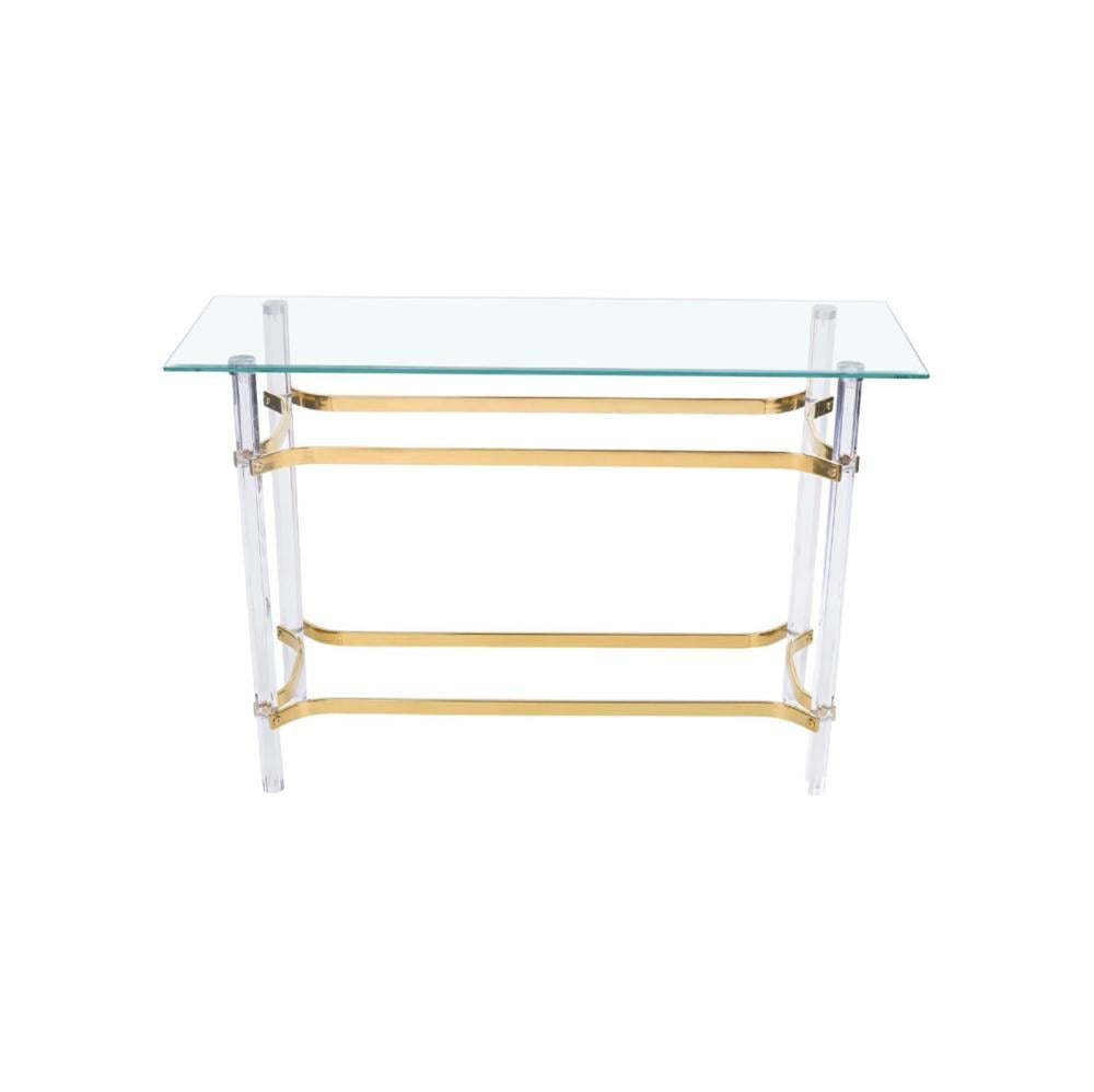 طاولة كونسول أنيقة بتصميم عصري يجمع بين الزجاج الشفاف واللمسات المعدنية الذهبية اللامعة. مثالية لوضعها في المداخل، غرف المعيشة أو الممرات لإضفاء لمسة فخامة وعصرية على الديكور.