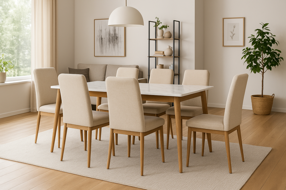 أضيفي لمسة من الفخامة والراحة إلى غرفة الطعام الخاصة بك مع طقم السفرة الرخام . يتميز الطقم بتصميم عصري أنيق يجمع بين سطح رخامي فاخر وكراسي قماش مبطن توفر أقصى درجات الراحة. هذا الطقم مثالي للعائلات أو الضيوف، حيث يمنح أجواء راقية للمكان مع الحفاظ على العملية والمتانة.