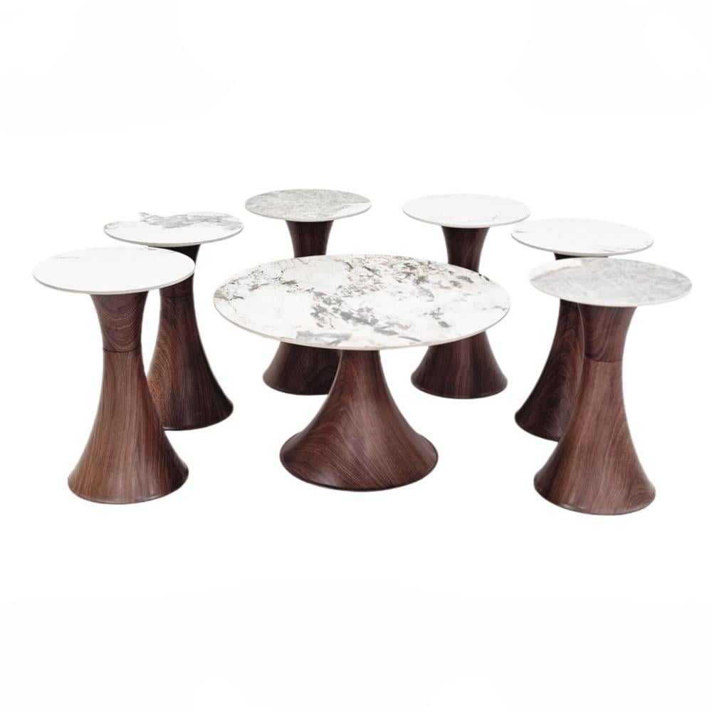 طقم من الطاولات الجانبية الفاخرة بتصميم عصري يجمع بين الأناقة والفخامة. يتميز بسطح سراميك دائري أنيق وقاعدة خشبية منحنية تضيف لمسة طبيعية ودافئة. الطاولات متناسقة الأشكال ويمكن استخدامها بشكل منفصل أو مجتمعة لتشكيل ديكور مميز في غرف المعيشة أو الاستقبال.