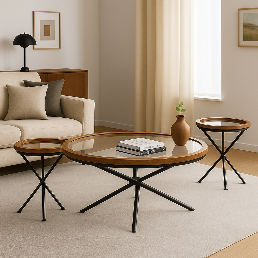 طقم فاخر من ثلاث طاولات يجمع بين الخشب الطبيعي والمعدن العصري بتصميم دائري أنيق. يتميز الطقم بإطار خشبي متين بلمسة طبيعية جذابة وسطح زجاجي شفاف يبرز جمال التصميم، مع قاعدة معدنية متقاطعة باللون الأسود تضيف ثباتًا وأناقة. الطقم مثالي لإضافة لمسة من الفخامة والدفء إلى غرفة المعيشة أو الاستقبال.