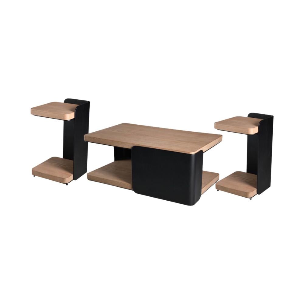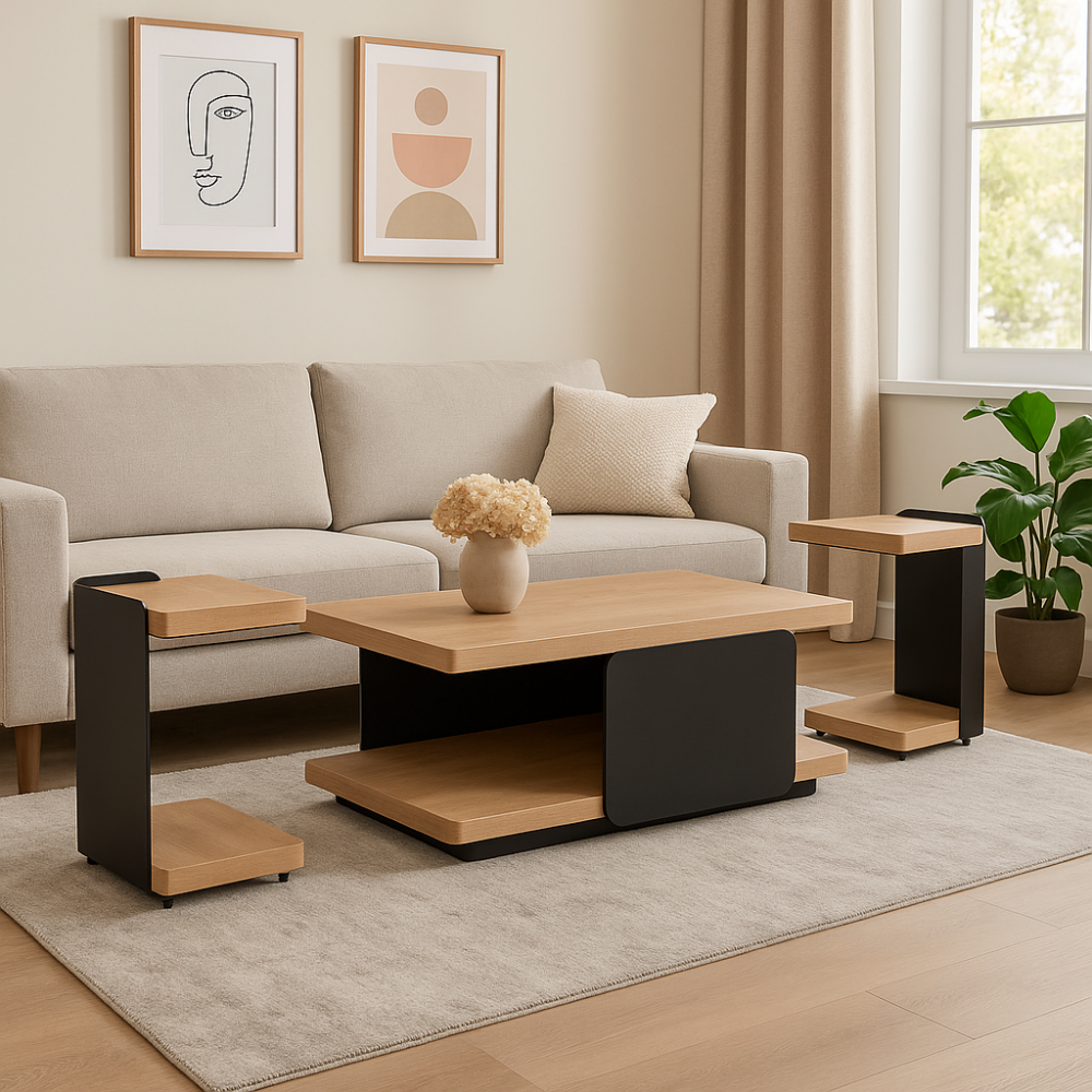 طقم طاولات أنيق بتصميم عصري يجمع بين الخشب الطبيعي والمعدن الأسود المطفي، يتكون من طاولة وسط مستطيلة وطاولتين جانبيتين بتصميم متماثل على شكل حرف “C”. يتميز الطقم بخطوطه البسيطة ولمساته الحديثة التي تضيف لمسة فاخرة لأي غرفة معيشة أو استقبال.