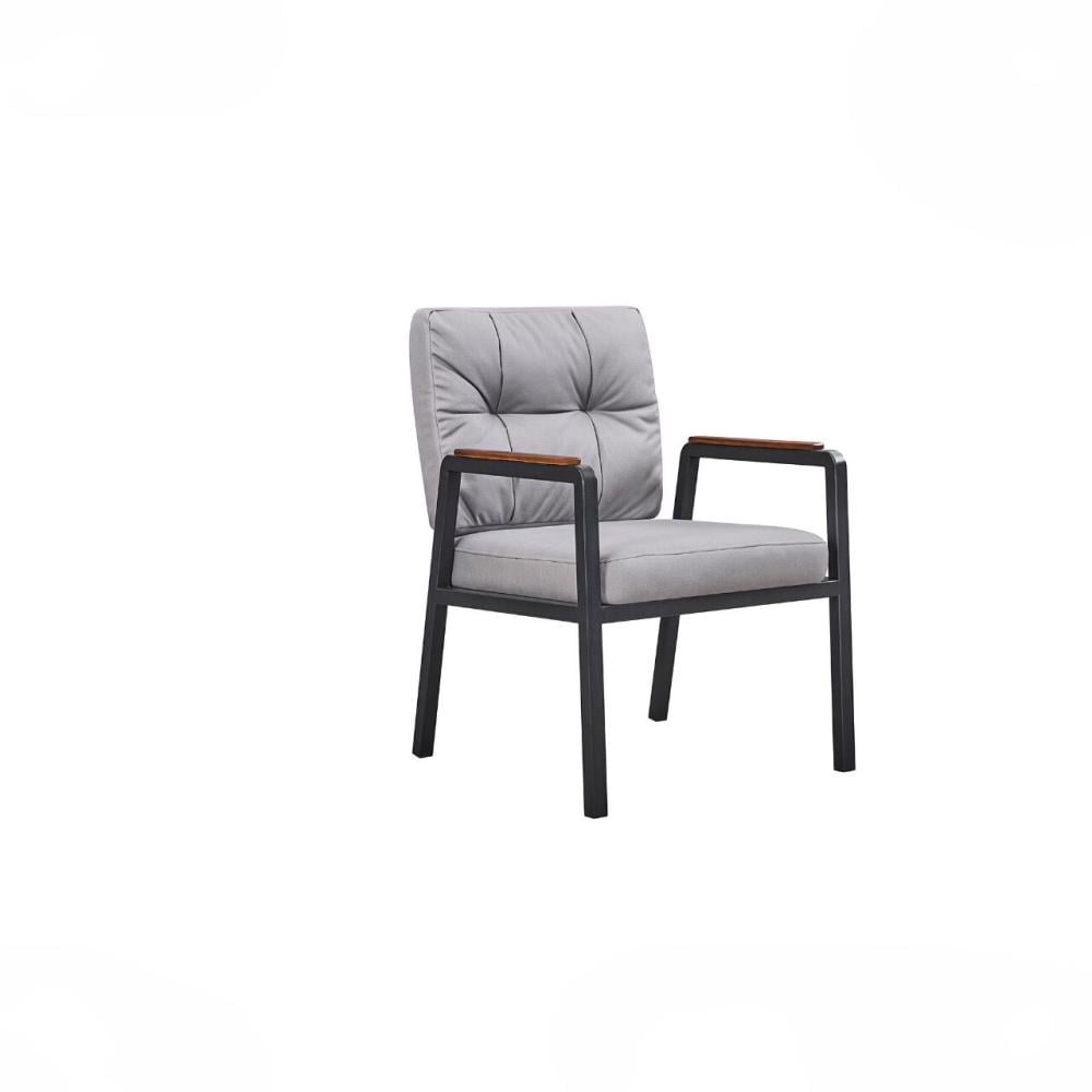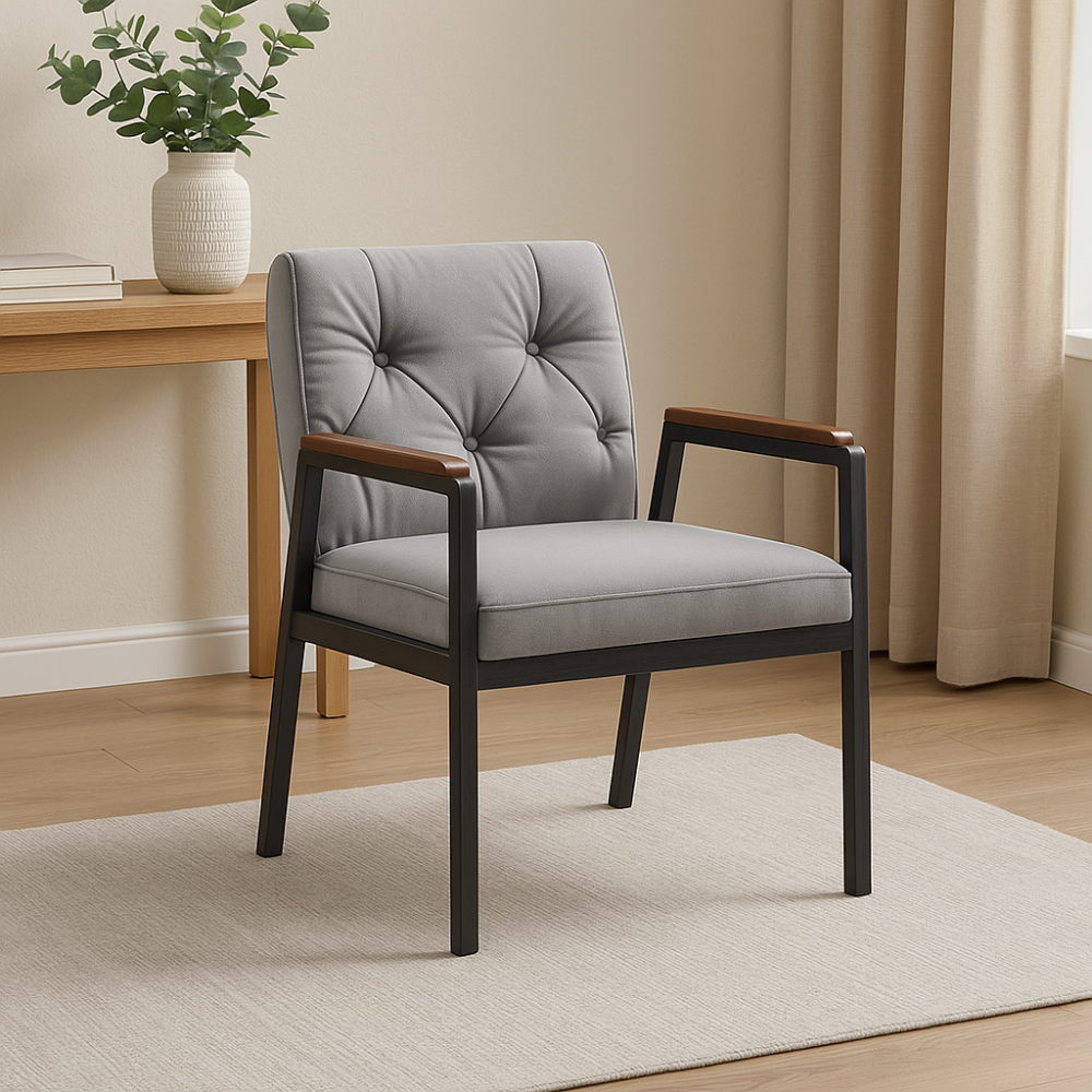 كرسي أنيق بتصميم عصري يجمع بين الراحة والفخامة، يتميز بوسائد مبطنة ناعمة من القماش الرمادي الفاخر وهيكل معدني قوي يمنح ثباتاً ومتانة عالية. ما يميّزه حقاً هو اللمسة الخشبية الأنيقة على مسند اليد التي تضيف لمسة دافئة وطبيعية للتصميم، لتجمع بين الحداثة والطابع الكلاسيكي الراقي.