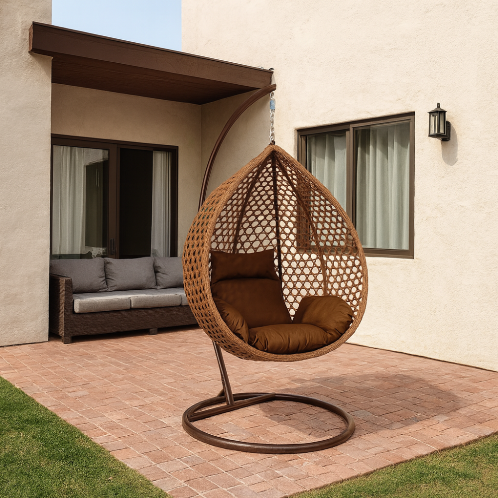 كرسي مرجيحه معلق أنيق بتصميم شبكي على شكل بيضاوي ، مزود بوسائد مبطنة باللون البني لتوفير أقصى درجات الراحة. يأتي مع قاعدة حديدية قوية وحامل معدني مقوس لتعليق الكرسي بشكل آمن، مما يجعله مناسبًا للاستخدام داخل المنزل أو خارجه في الحديقة أو البلكونة.