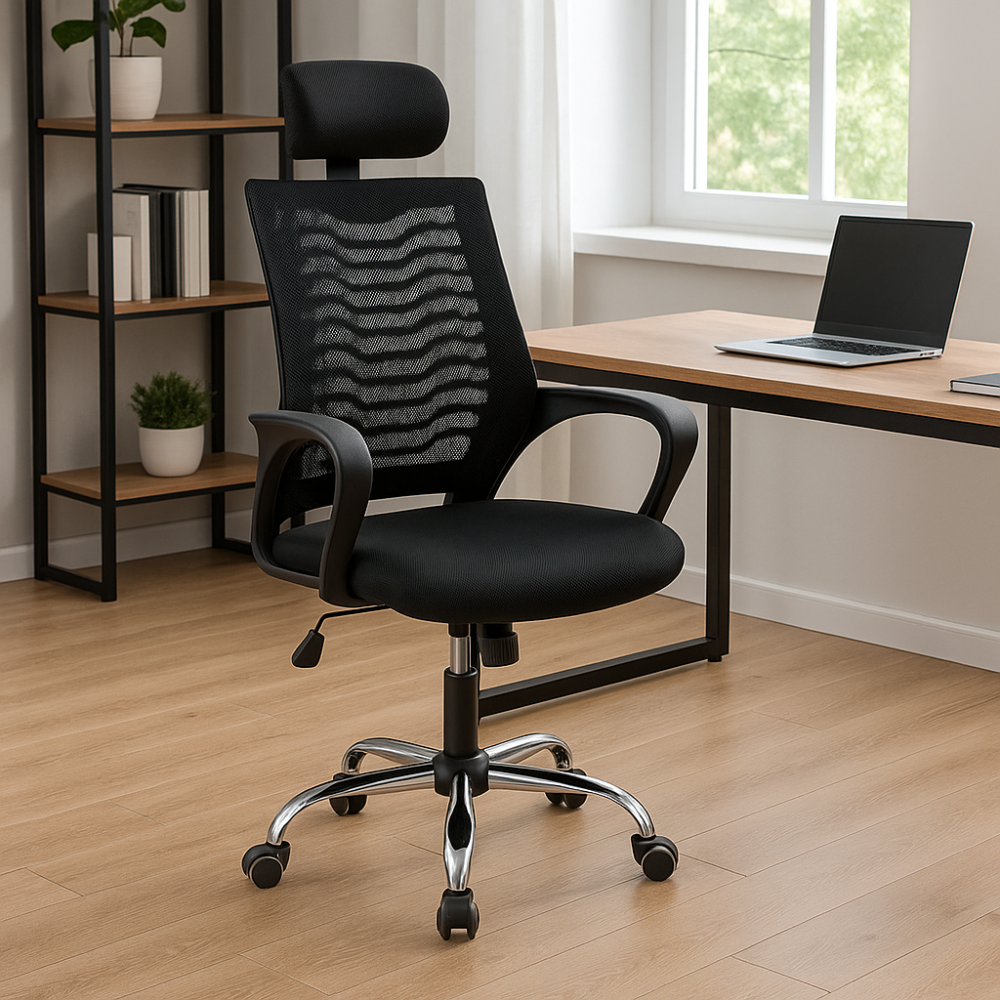 كرسي مكتبي بتصميم عصري يجمع بين الراحة والدعم القوي للظهر. يتميز بمسند ظهر شبكي يسمح بمرور الهواء للحفاظ على الانتعاش أثناء الجلوس لفترات طويلة، مع وسادة جلوس إسفنجية مريحة وقابلة للتعديل من حيث الارتفاع لتناسب جميع المستخدمين.