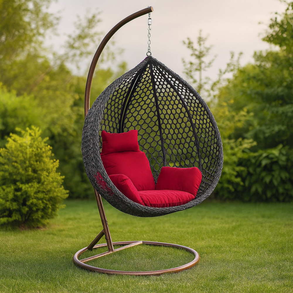 كرسي مرجيحه معلق أنيق بتصميم شبكي على شكل بيضاوي ، مزود بوسائد مبطنة باللون الأحمر لتوفير أقصى درجات الراحة. يأتي مع قاعدة حديدية قوية وحامل معدني مقوس لتعليق الكرسي بشكل آمن، مما يجعله مناسبًا للاستخدام داخل المنزل أو خارجه في الحديقة أو البلكونة.