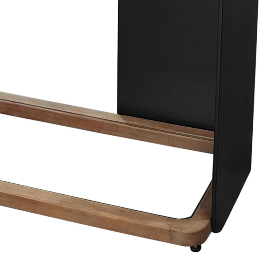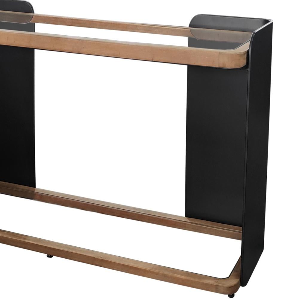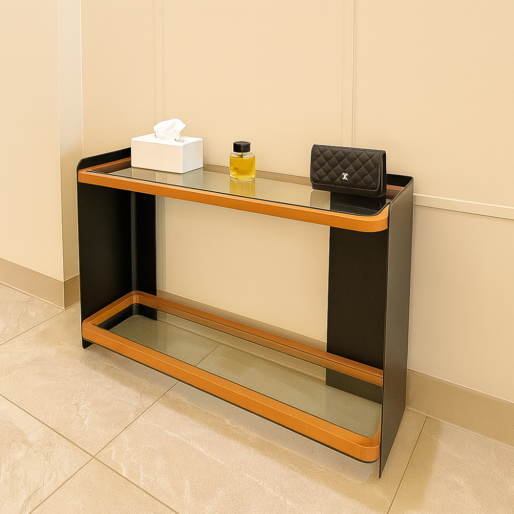 كونسول عصري بتصميم هندسي بسيط يجمع بين الخشب الطبيعي والمعدن الأسود والسطح الزجاجي، مناسب لمداخل المنازل وغرف المعيشة. يتميز بلمسة فاخرة تضيف الأناقة والرقي للمكان، ويمكن استخدامه كطاولة زينة أو لوضع الديكورات والإكسسوارات.