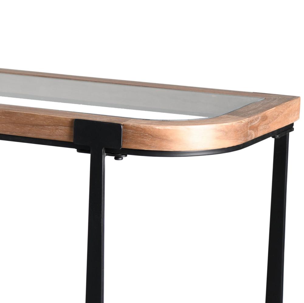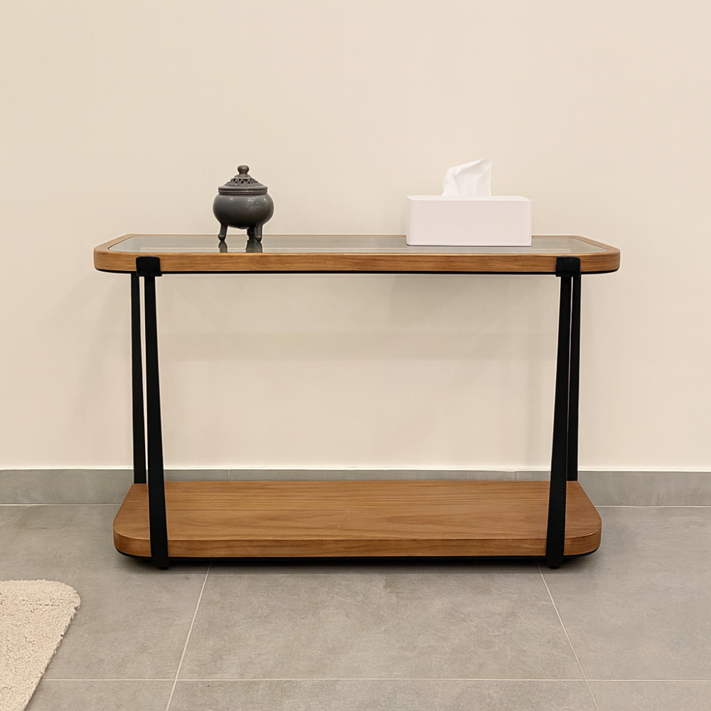 كونسول أنيق بتصميم عصري يجمع بين الخشب الطبيعي والمعدن الأسود مع سطح زجاجي شفاف يمنح المكان لمسة من الفخامة والاتساع البصري. مثالي لمداخل المنازل أو غرف المعيشة، ويضفي طابعاً حديثاً وراقياً على الديكور الداخلي.