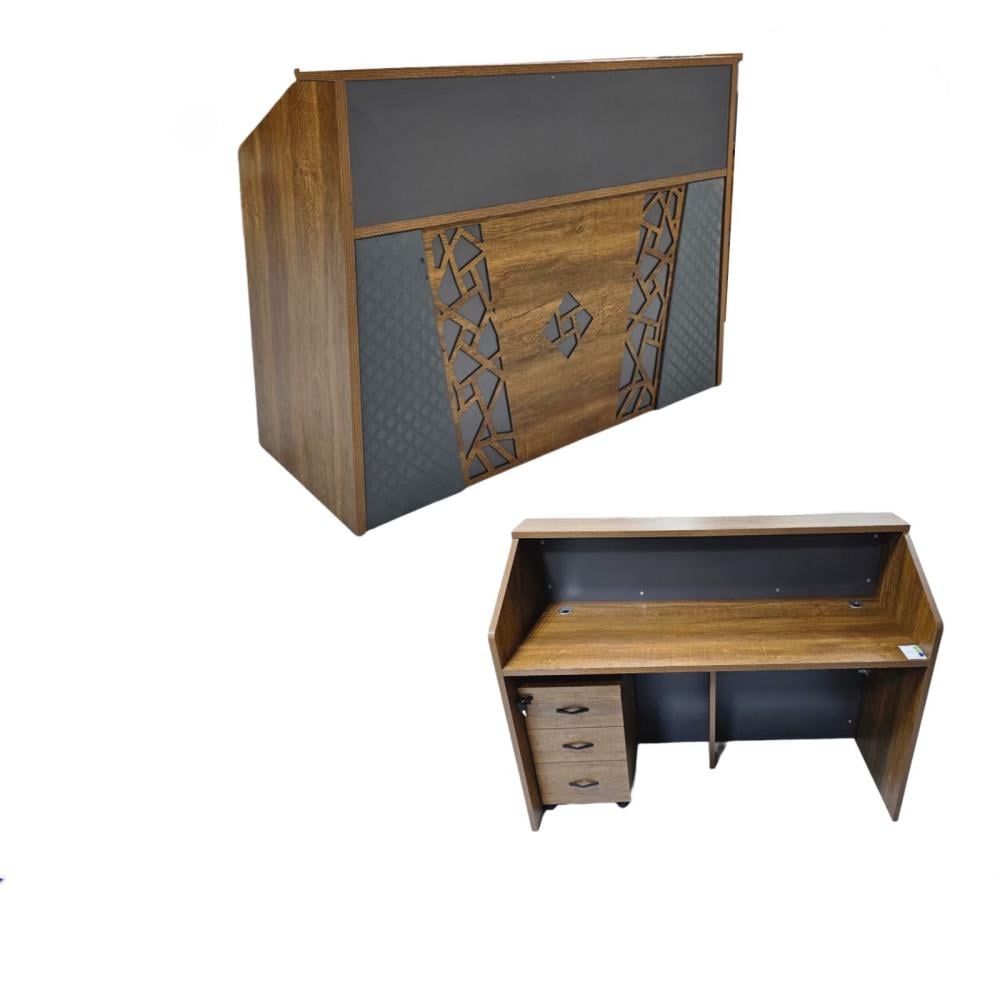 مكتب استقبال أنيق يجمع بين التصميم العصري واللمسات الكلاسيكية، يتميز بمزيج من الخشب الطبيعي واللون الرمادي الداكن مع زخارف هندسية مفرغة تضفي طابعاً فريداً على واجهته الأمامية. يُستخدم هذا المكتب في مداخل المكاتب، صالات العرض، الفنادق، أو المحلات التجارية، ليمنح انطباعاً احترافياً وأنيقاً عند استقبال العملاء.