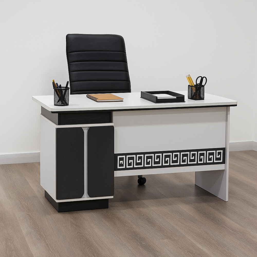 تحتاج مكتب خشبي انيق ومتين ؟ هذا المكتب أفضل خيار مناسب للاستخدام في المكاتب أو المنازل، يتميز بخطوط عصرية وزخرفة هندسية أنيقة تضيف لمسة جمالية للمكان. يوفر سطحًا واسعًا للعمل مع وحدات تخزين عملية لتسهيل تنظيم الأدوات والملفات.