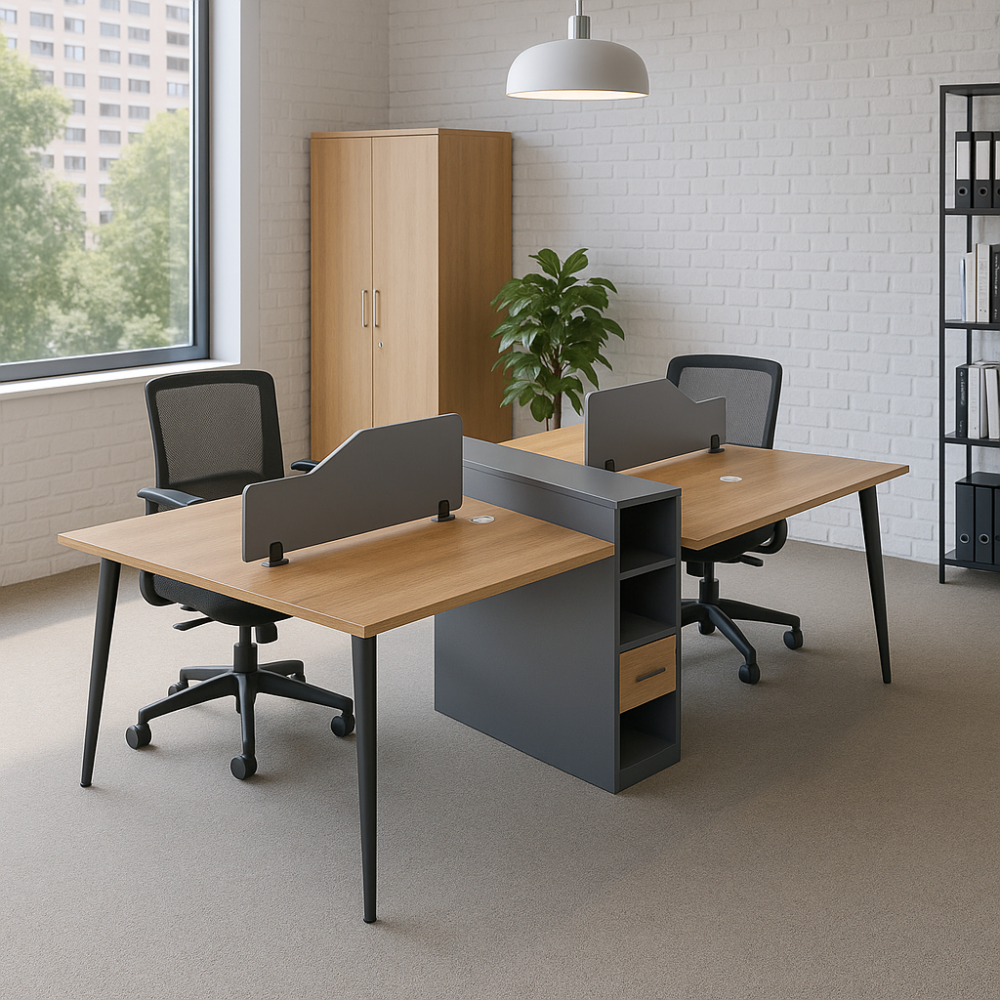 وحدة عمل مصممه لتخدم 4 أشخاص في وقت واحد، يوفر مساحة عمل واسعة ومقسمة بشكل أنيق باستخدام فاصل مكتبي عصري . تتميز وحدة العمل بتصميم خشبي أنيق مع قاعدة وأدراج جانبية باللون الرمادي ، مما يجعله مناسبًا لمكاتب الشركات، بيئات العمل المشتركة، أو حتى للمكاتب .